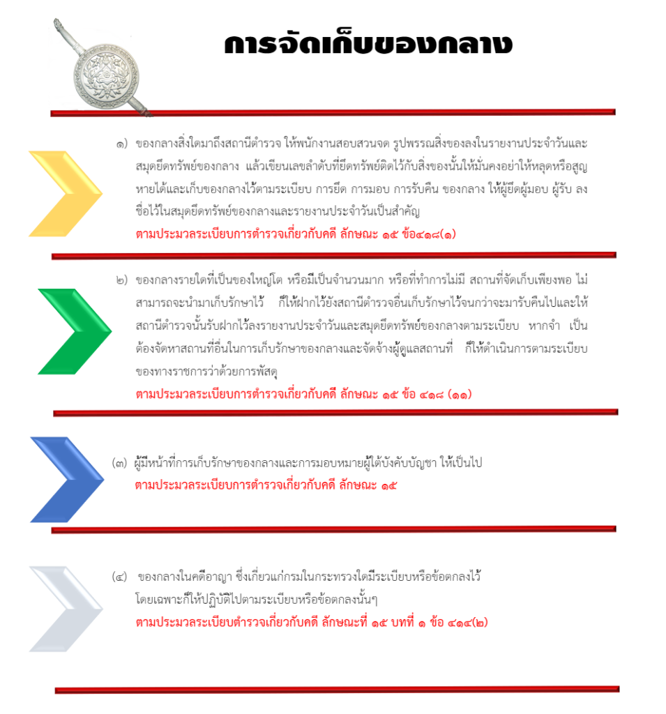- ระเบียบ ตร. ว่าด้วยการเก็บรักษาของกลางและการจำแหน่ายของกลาง พ.ศ. 2565